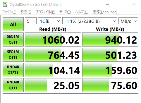 と言ってもわたしのPC環境ではDP Alt対応ではないUSB 3.2 Gen 2x1(10Gbps)ポートしかないのでこれを上回るテストはできない。公称シーケンシャルリード1000MB/s、ライト900MB/sのKingston USBメモリを使ってテストした。