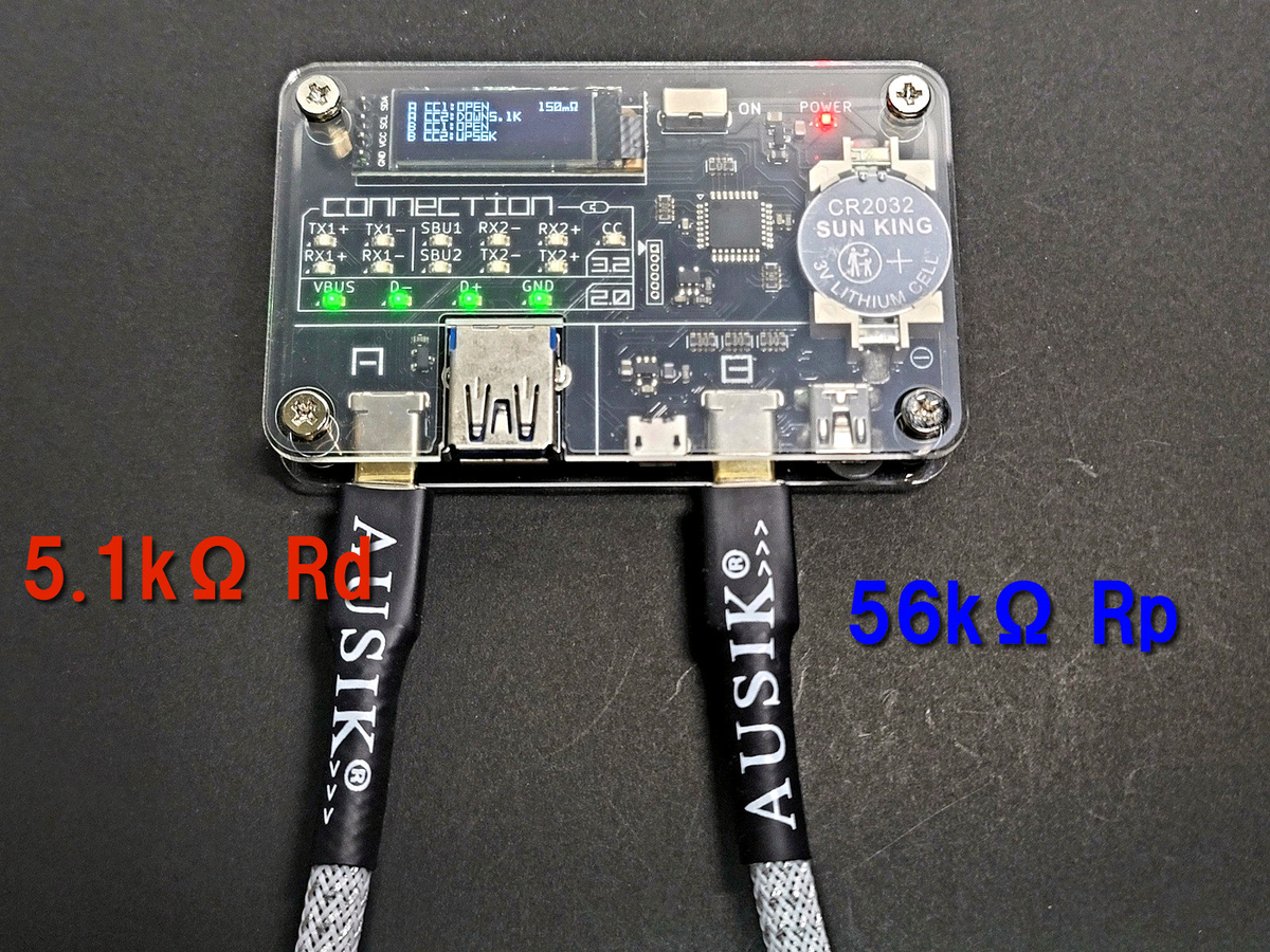 - 子(シンク)周辺機器側レセプタクルCC1/CC2を5.1kΩ抵抗でGNDとつなぐ