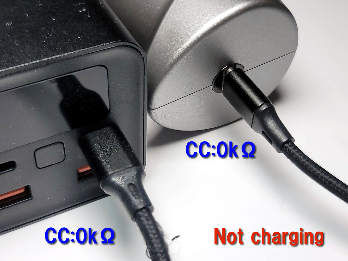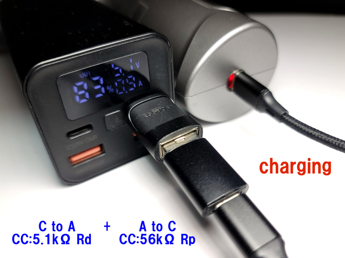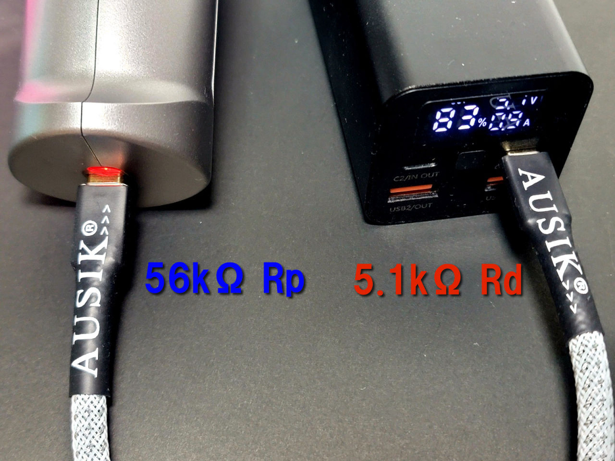 - 親(ソース)充電器側レセプタクルCC1/CC2を56~10kΩ抵抗でVBUSとつなぐ