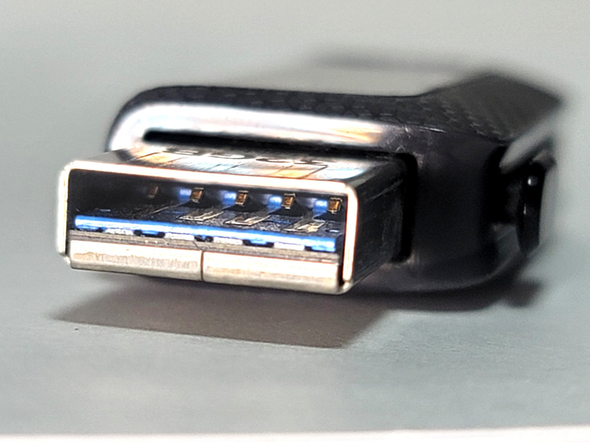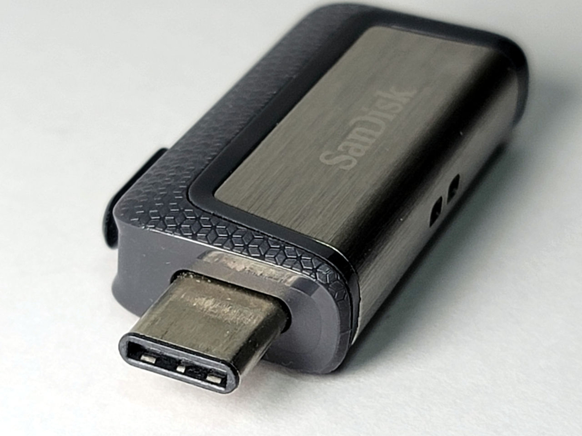 これはスライドによってType-AにもType-Cにもなる両用USBメモリだ。Type-Aは9ピンあるのでUSB 3.2なのがわかる。もっぱらType-C専用メモリとしてスマホやPCに挿して使うことが多い。このメモリをスマホやPCに挿して電力供給を受けてメモリとして動作するということはこれ自体がOTG機能を有しているということになる。