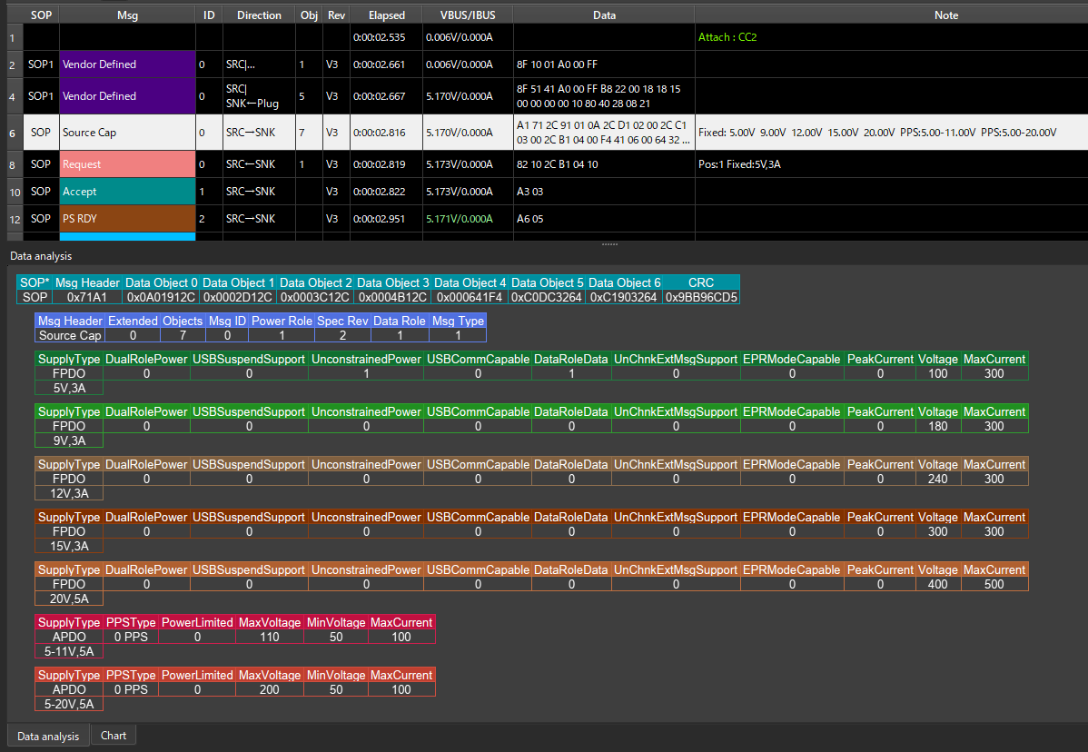 KM003Cがmotorolaプロトコルを検出するときのPDパケットを見ておこう。当初20V⎓5Aから、2回目の通知で20V⎓6.25Aになっていることがわかる。