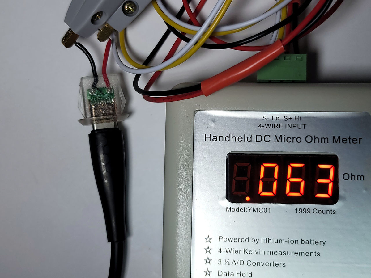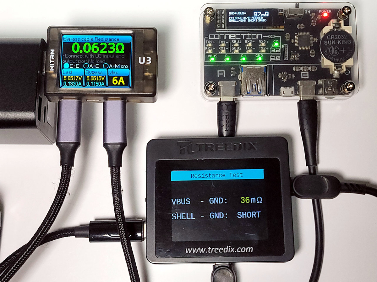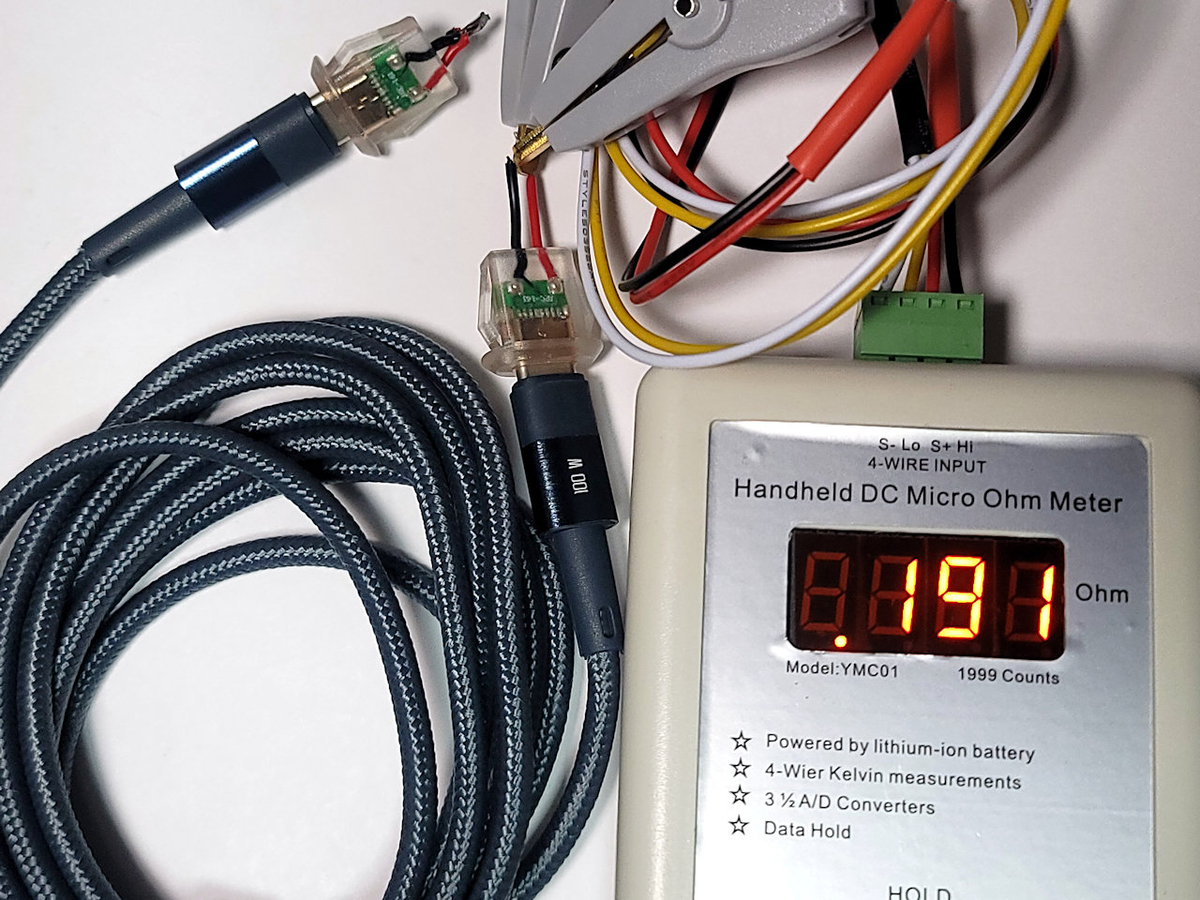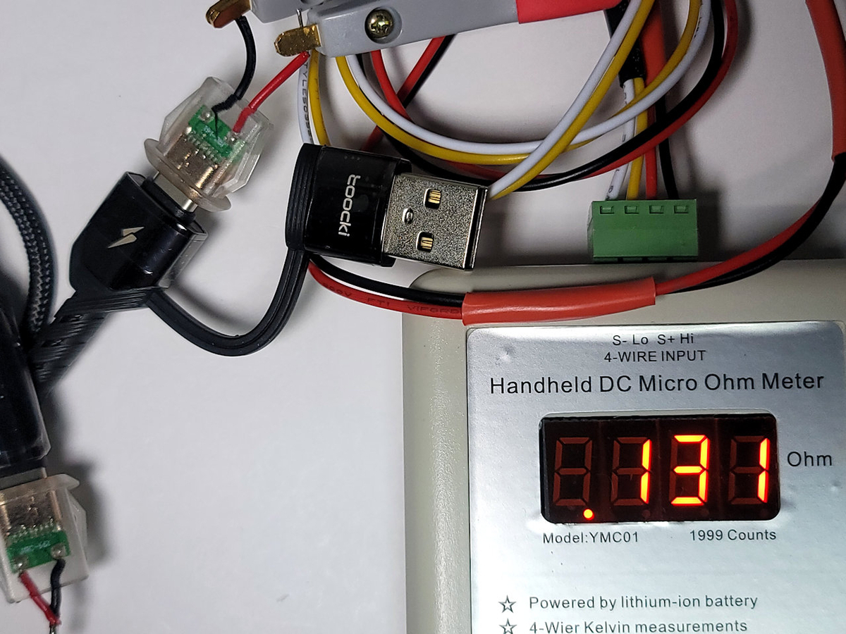 端末にケーブル両端を挿してVBUS+GNDラインの抵抗値が測定できる機械は手持ちのもので、UCC2、UCTとWITRN U3だけだ。これにミリオームメーター(MOM)を加えて、以前検証した低中高抵抗のレンジで正確さを検証してみる。