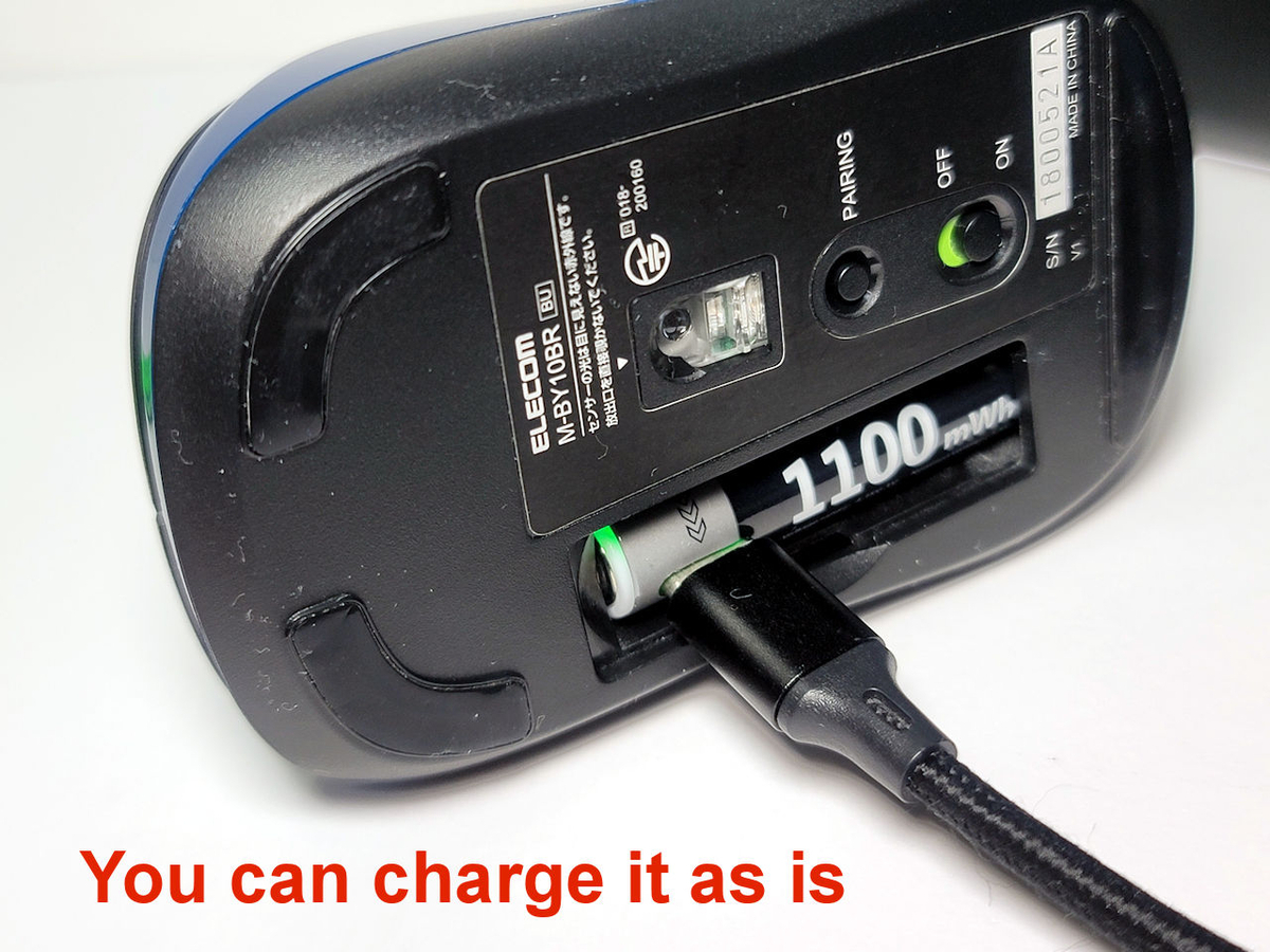 第二条件、乾電池側のレセプタクル内に5.1kΩのプルダウン抵抗があること。前回のPUJIMAXというブランドと同様にこのハードルも通過した。これでPD充電器+C to Cケーブルで充電が行える。