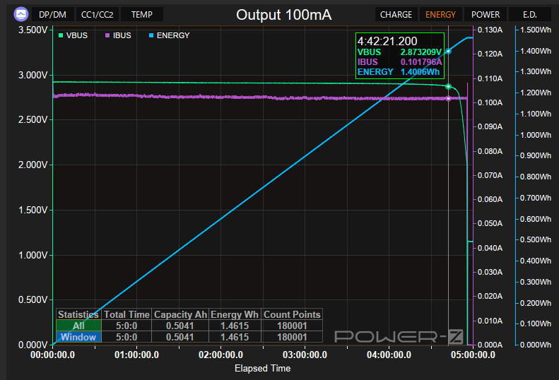 実際に充電したところ概ね1時間で1100mWhに達し、段階的に下降しながら1200mWhを受け入れた。やや電流の振れが気になるが容量詐欺ではなかった。